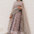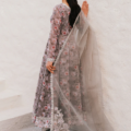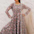 This stunning frock with digital prints, showcases exquisite hand-embellishment on the neckline. The embroidered borders gives a luminous finish.