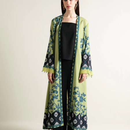 - This stylish wrap-around abaya made in soft ivory bubble crepe features a flattering V-neckline and contrast piping detail along the side panels, sleeves, and neckline. Perfect for a chic, effortless look. Pair it with ‘Beige contrast cover up’ to complete the look.