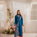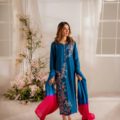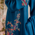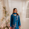 Presented in a captivating shade of haute blue, this ensemble showcases exquisite embroideries in soft, subtle variations, meticulously crafted with fine threadwork and enhanced with shimmering gold accents. The graceful top-down design, adorned with whimsical floral motifs that gently flow across the pure silk fabric, exudes a refined femininity, elevating the outfit with elegance in every detail. This look radiates an enduring charm that transcends time.