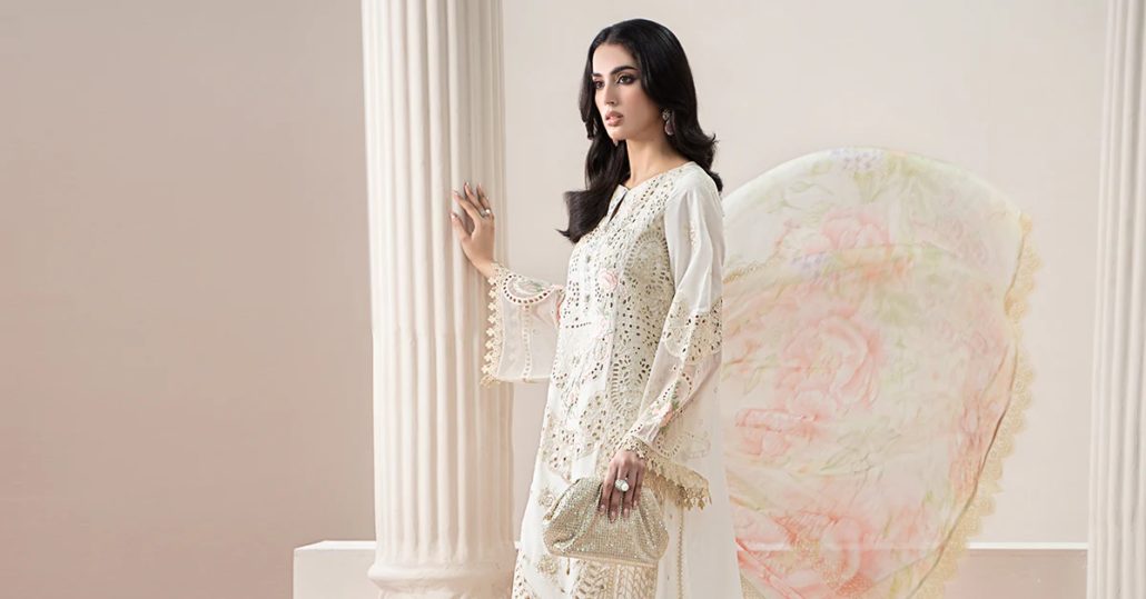 Spray Embroidered Sleeves With Embroidered Organza Border & Lace Detailing