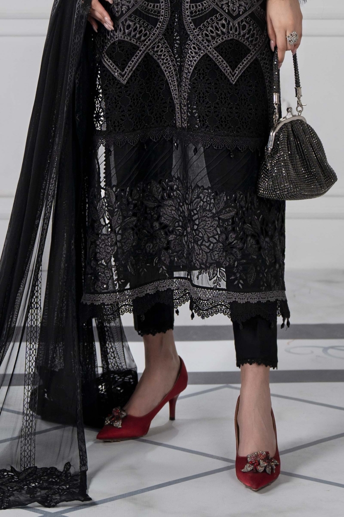 Embroidered Organza Neckline With Pearls & Loop Buttons Detailing