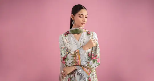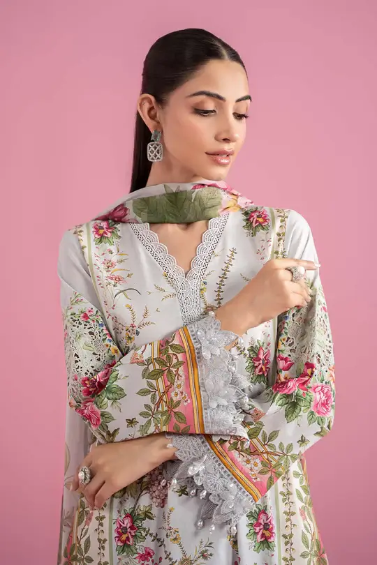 Printed Sleeves With Organza 3D Flowers Embroidered Border