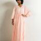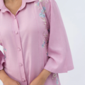 - This pink embroidered button down dress made in soft linen fabric features two-piece collar, front placket with button closure, three quarter flared sleeves, tie-up detail at side seam and flared hem.
