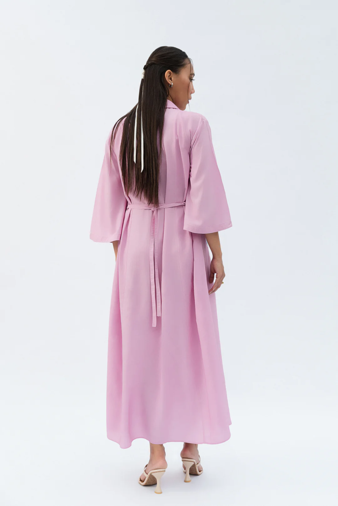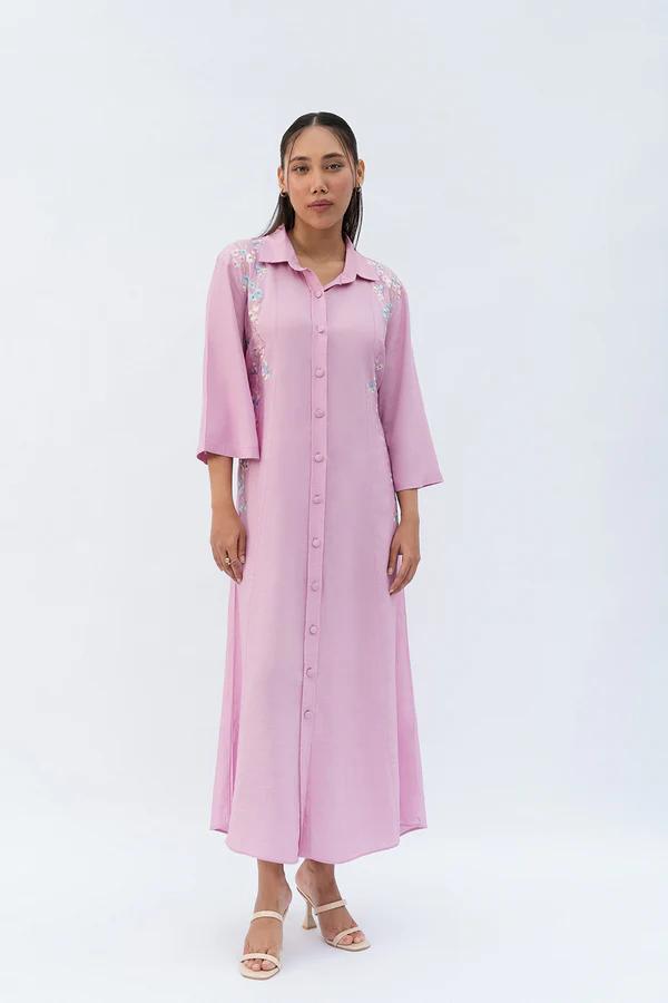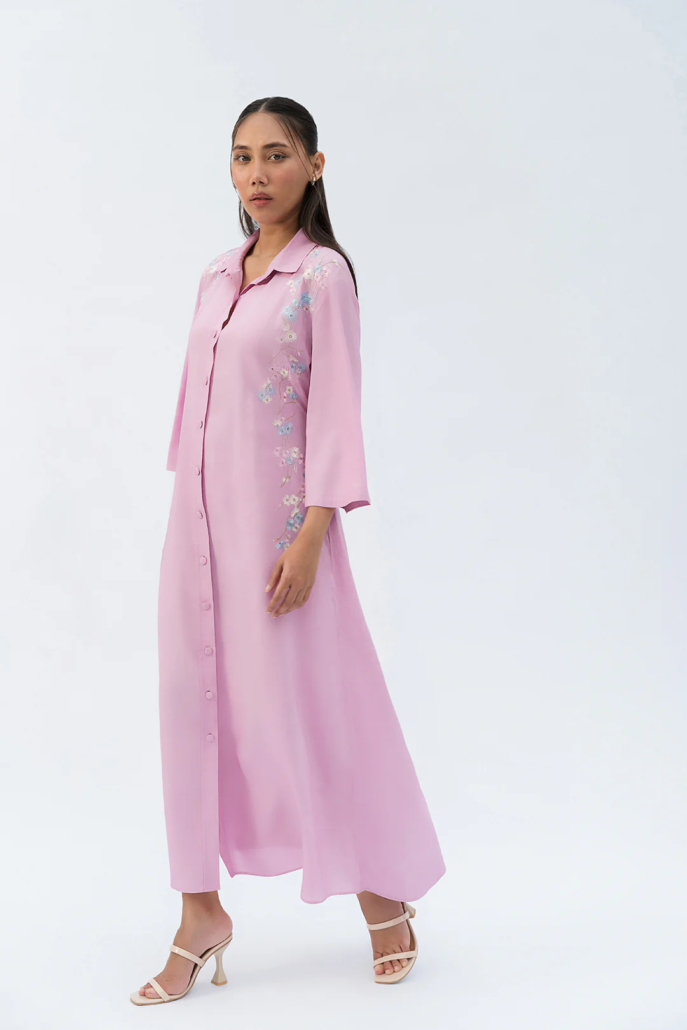 - This pink embroidered button down dress made in soft linen fabric features two-piece collar, front placket with button closure, three quarter flared sleeves, tie-up detail at side seam and flared hem.