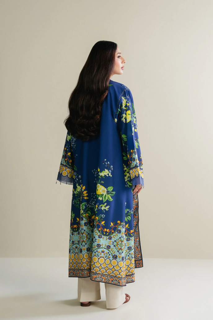 - This shrug made in blue soft crepe fabric in floral print features front-open silhouette, lace and tassle detail on front, square armhole with lace insertion, full length sleeves with lace insertions, organza cuffs with crystal hangings and side slits.