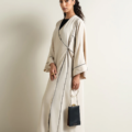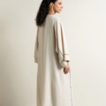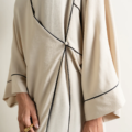 - This stylish wrap-around abaya made in soft ivory bubble crepe features a flattering V-neckline and contrast piping detail along the side panels, sleeves, and neckline. Perfect for a chic, effortless look. Pair it with ‘Beige contrast cover up’ to complete the look.