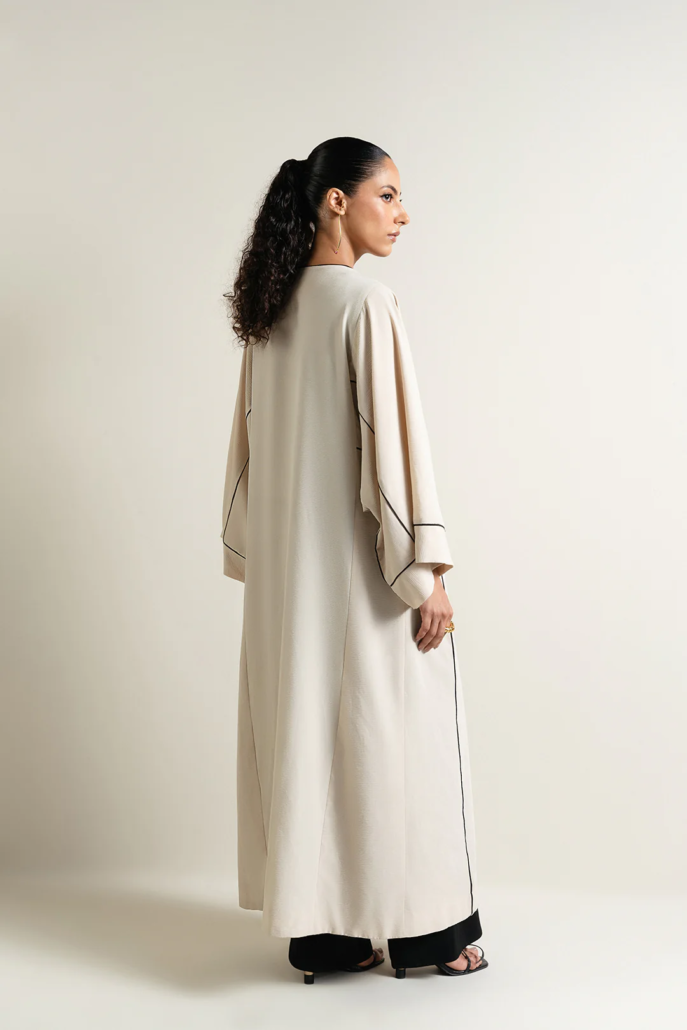 - This stylish wrap-around abaya made in soft ivory bubble crepe features a flattering V-neckline and contrast piping detail along the side panels, sleeves, and neckline. Perfect for a chic, effortless look. Pair it with ‘Beige contrast cover up’ to complete the look.
