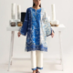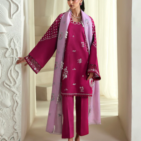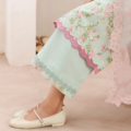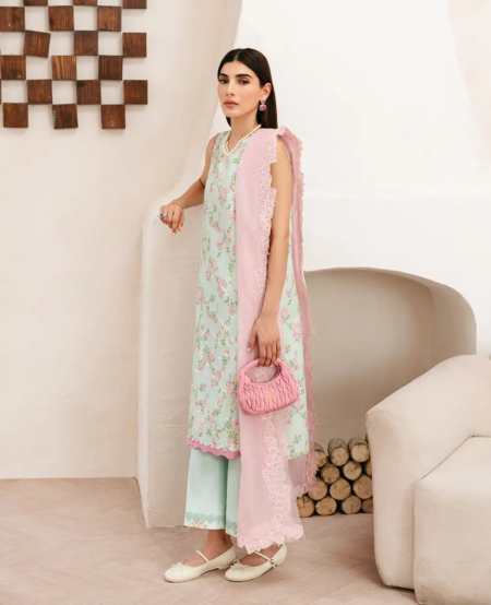 This long-length printed shirt combines elegance and vibrancy, featuring delicate floral embroidery on a soft apple green base. The embroidery, crafted in pinks, yellows, and subtle white accents, is enhanced with schiffli embroidery in white, adding a beautiful touch of texture and intricacy to the design. Enhanced with color block tatami border on hem the shirt is further decorated with fine stitching details, giving it depth and structure for a sophisticated, modern look. Paired with a contrasted pink dupatta, this ensemble is completed with a soft yet bold pop of color. The dupatta is enhanced with a printed floral border, beautifully complementing the shirt’s delicate embroidery. The outfit is finished with culottes, combining modern comfort with refined style and fluidity.