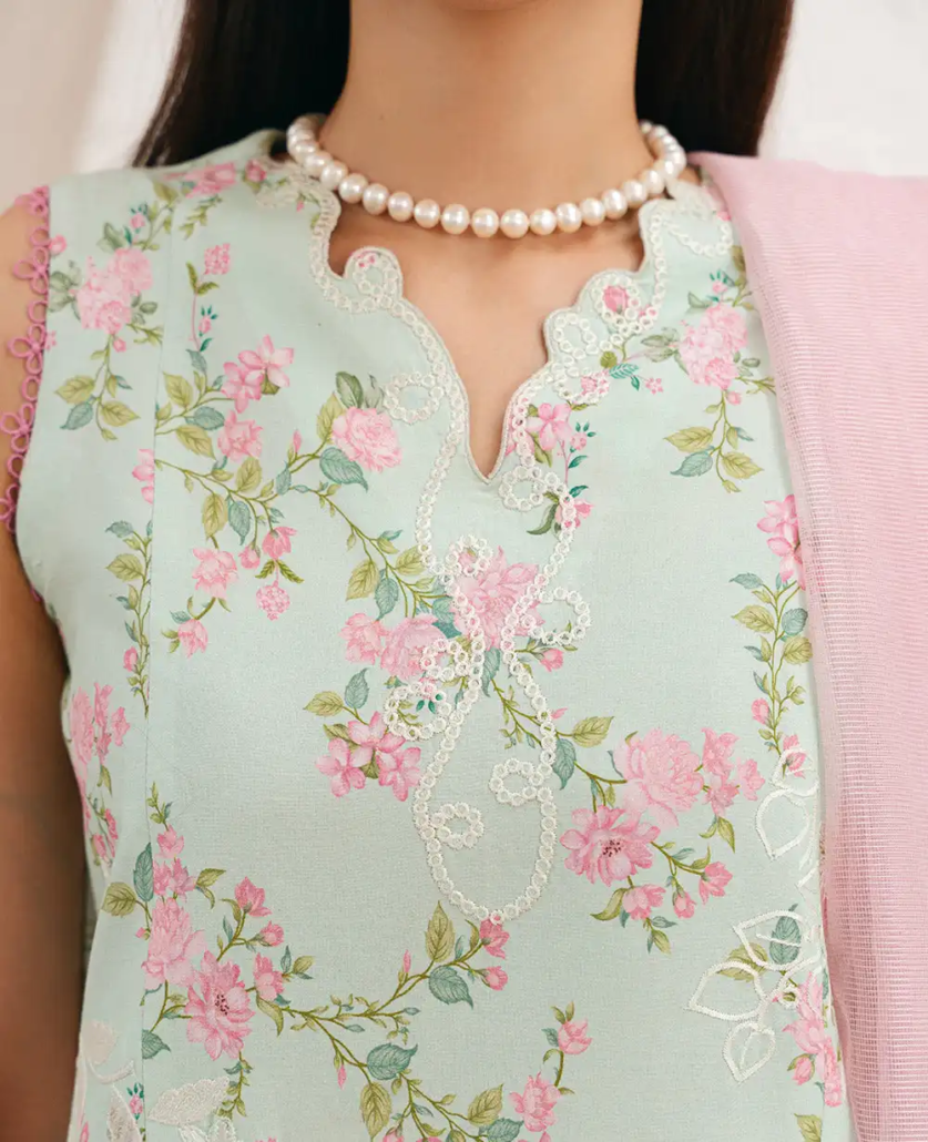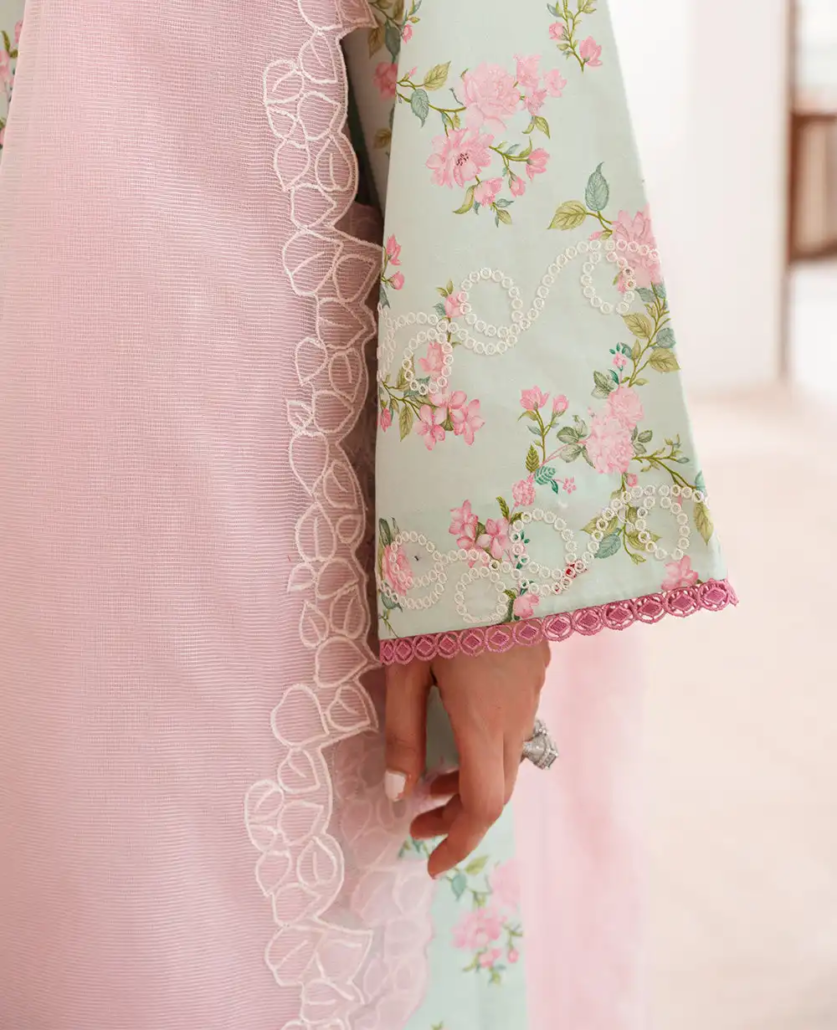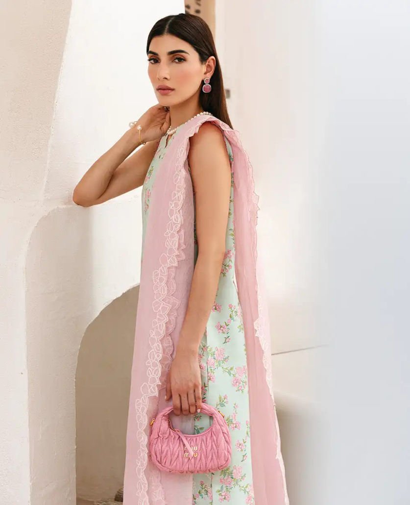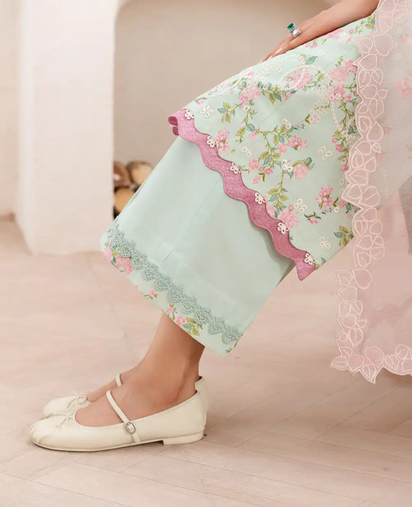 This long-length printed shirt combines elegance and vibrancy, featuring delicate floral embroidery on a soft apple green base. The embroidery, crafted in pinks, yellows, and subtle white accents, is enhanced with schiffli embroidery in white, adding a beautiful touch of texture and intricacy to the design. Enhanced with color block tatami border on hem the shirt is further decorated with fine stitching details, giving it depth and structure for a sophisticated, modern look. Paired with a contrasted pink dupatta, this ensemble is completed with a soft yet bold pop of color. The dupatta is enhanced with a printed floral border, beautifully complementing the shirt’s delicate embroidery. The outfit is finished with culottes, combining modern comfort with refined style and fluidity.