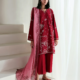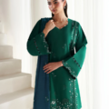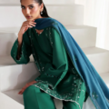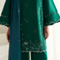 A mid-length, panelled shirt designed in delicate self-on-self monotones, featuring intricate floral embroidery that exudes subtle elegance. The neckline and sleeves are thoughtfully enhanced with detailed ivory embroidery, adding depth and refinement to the silhouette. Paired with matching culottes featuring scalloped detailing and finished with soft ivory lace for a graceful edge. The look is elevated with a contrasting dusty teal dupatta, adorned with floral bunches that bring a fresh, artistic touch to the ensemble — a perfect blend of understated charm and modern sophistication.