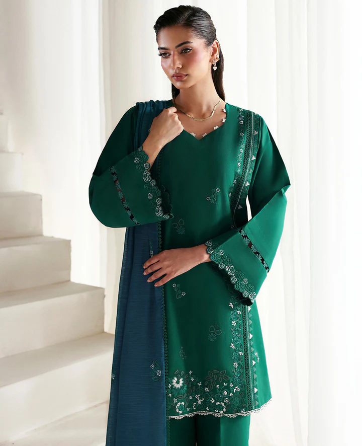 A mid-length, panelled shirt designed in delicate self-on-self monotones, featuring intricate floral embroidery that exudes subtle elegance. The neckline and sleeves are thoughtfully enhanced with detailed ivory embroidery, adding depth and refinement to the silhouette. Paired with matching culottes featuring scalloped detailing and finished with soft ivory lace for a graceful edge. The look is elevated with a contrasting dusty teal dupatta, adorned with floral bunches that bring a fresh, artistic touch to the ensemble — a perfect blend of understated charm and modern sophistication.
