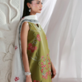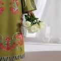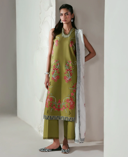 Elevate your wardrobe with this elegant long-length olive shirt, beautifully adorned with intricate floral and ribbon-style embroidery. Subtle hints of red and coral add a refreshing pop of color, making the design stand out with sophistication. The round hem gives the shirt a graceful silhouette, while tonal color-block detailing in black and white enhances its modern appeal. Paired with a contrasting white dupatta crafted from karandi net, this ensemble strikes the perfect balance between tradition and contemporary charm.