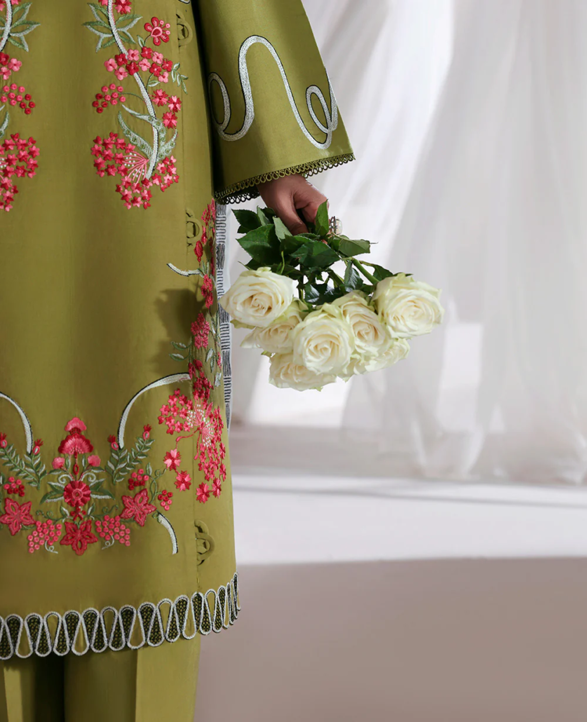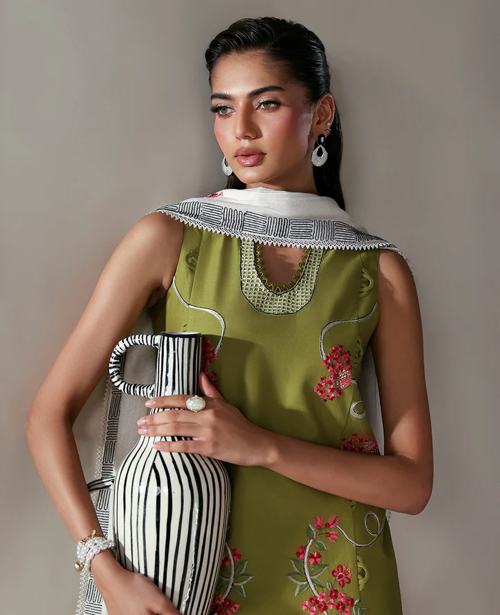 Elevate your wardrobe with this elegant long-length olive shirt, beautifully adorned with intricate floral and ribbon-style embroidery. Subtle hints of red and coral add a refreshing pop of color, making the design stand out with sophistication. The round hem gives the shirt a graceful silhouette, while tonal color-block detailing in black and white enhances its modern appeal. Paired with a contrasting white dupatta crafted from karandi net, this ensemble strikes the perfect balance between tradition and contemporary charm.