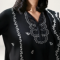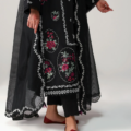 This long black shirt features crisp white structural details and bold color blocks with delicate embroidery in shades of hot pink and red. Paired with matching trousers and a black dupatta finished with a white embroidered border and tassels, it’s the perfect blend of modern style and subtle elegance.