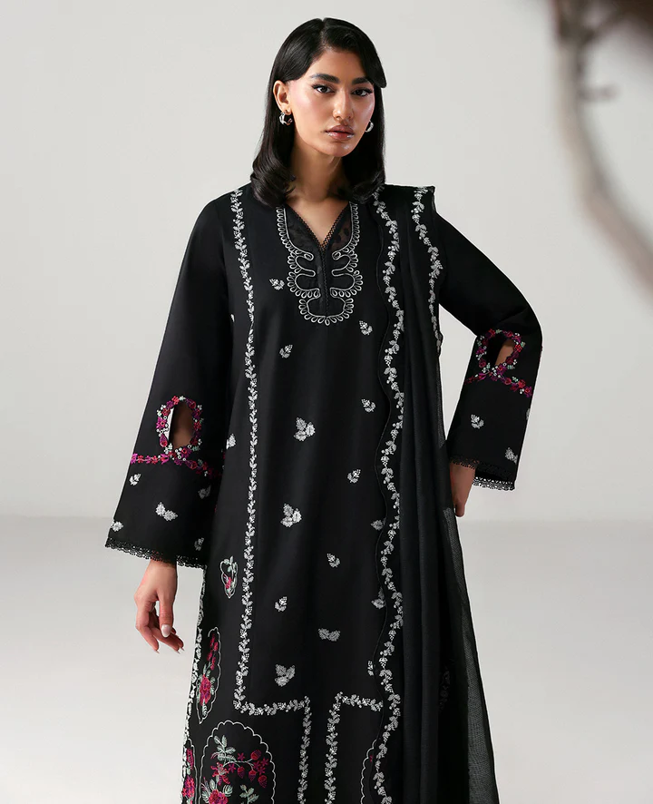 This long black shirt features crisp white structural details and bold color blocks with delicate embroidery in shades of hot pink and red. Paired with matching trousers and a black dupatta finished with a white embroidered border and tassels, it’s the perfect blend of modern style and subtle elegance.