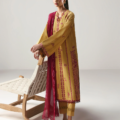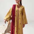 This long mustard shirt is beautifully adorned with vibrant red embroidery throughout, creating a striking contrast that celebrates traditional craftsmanship. It’s paired with a rich maroon dupatta featuring an intricate four-sided paisley border, adding depth and elegance to the ensemble. Finished with tonal trousers, this look effortlessly blends bold colors and classic design for a timeless, sophisticated style.