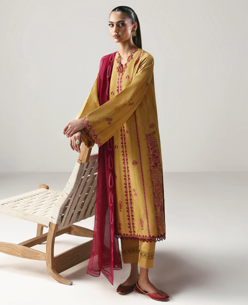 This long mustard shirt is beautifully adorned with vibrant red embroidery throughout, creating a striking contrast that celebrates traditional craftsmanship. It’s paired with a rich maroon dupatta featuring an intricate four-sided paisley border, adding depth and elegance to the ensemble. Finished with tonal trousers, this look effortlessly blends bold colors and classic design for a timeless, sophisticated style.