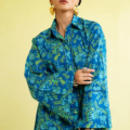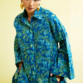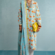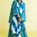 The button-down kurta, relaxed with wide sleeves and a crisp collar, is detailed with playful tassels at the neckline for that easygoing charm. Fresh green botanicals trail across the canvas, keeping the vibe natural yet bold. Paired with matching printed pants and a color-block voile dupatta in shades of blue and ivory, the look is as breezy as it is statement-making.