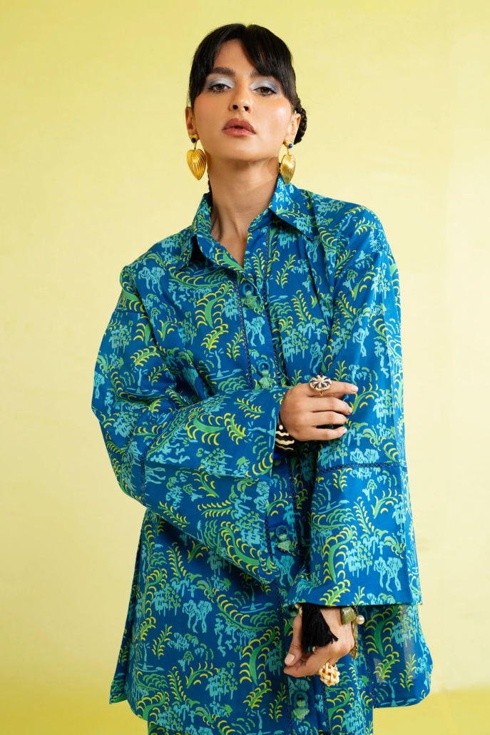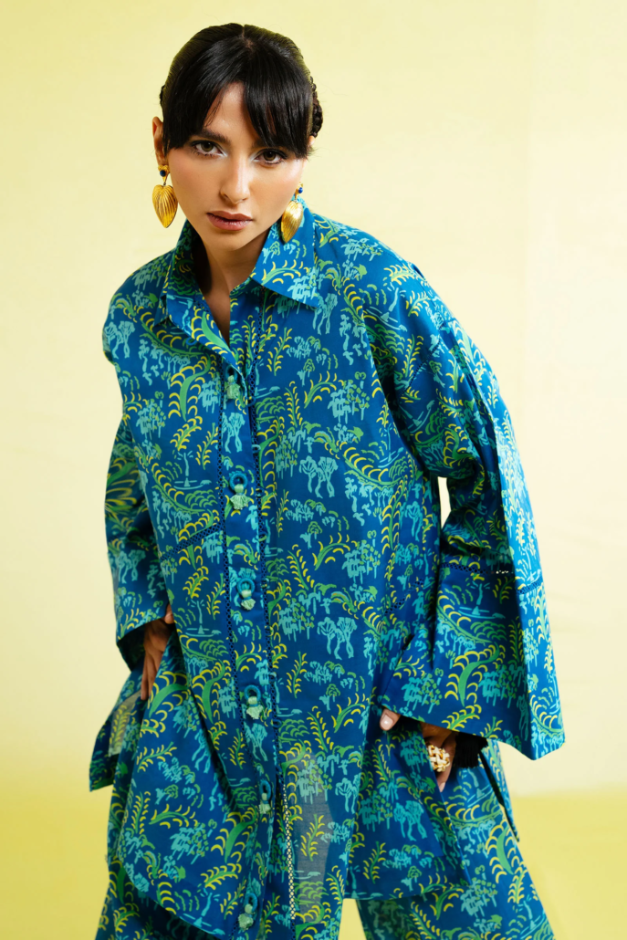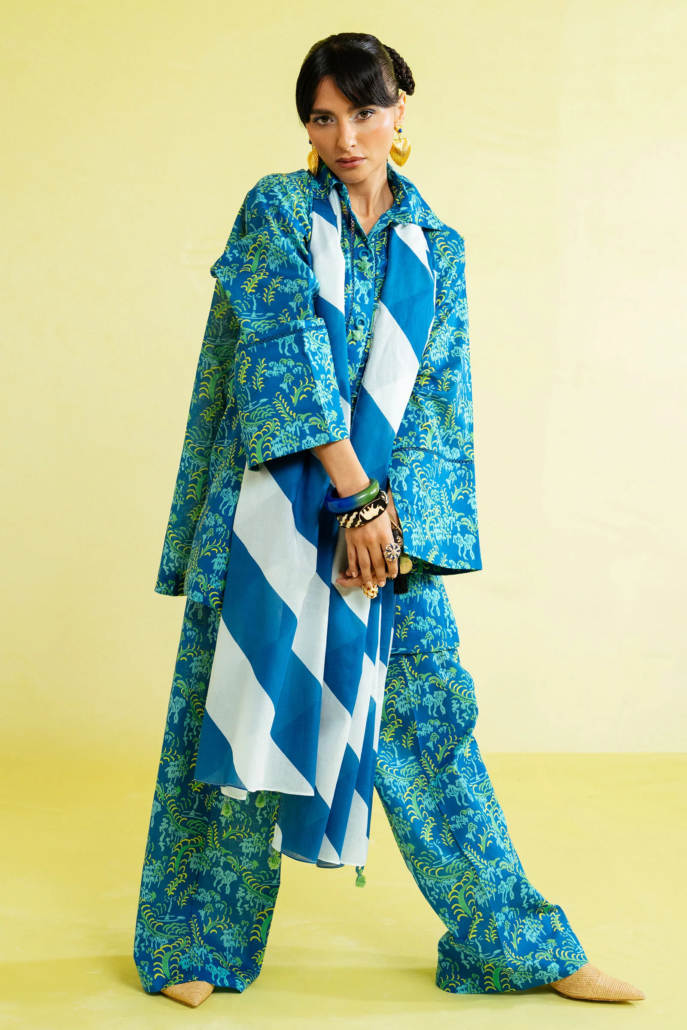 The button-down kurta, relaxed with wide sleeves and a crisp collar, is detailed with playful tassels at the neckline for that easygoing charm. Fresh green botanicals trail across the canvas, keeping the vibe natural yet bold. Paired with matching printed pants and a color-block voile dupatta in shades of blue and ivory, the look is as breezy as it is statement-making.