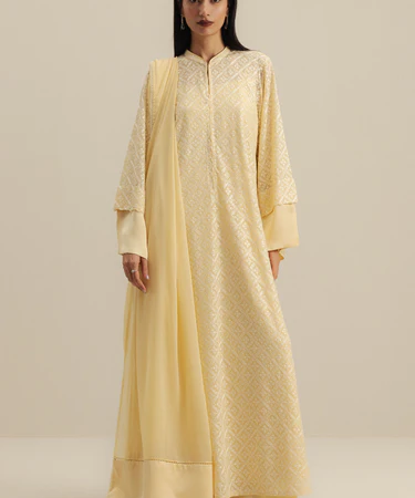 Featuring here is a short-paneled kurta adorned with intricate white embroidery and embellished detail on the neckline. It is paired with white embroidered tapered shalwar, maintaining a balanced and elegant appeal. The outfit is completed with a embroidered dupatta in the same hue.