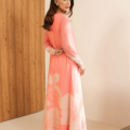 - This dress, made in soft georgette chiffon fabric, in floral print, features crew neckline with slit along the back, full length sleeves and flared hem.