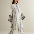 - This top made in black and white soft viscose-jacquard fabric features crew neck with hook and eye closure on front, embroidered placket with pearl bunches, flared sleeves with embroidered cuffs and side slits. It has lace insertion in armhole and sleeves.