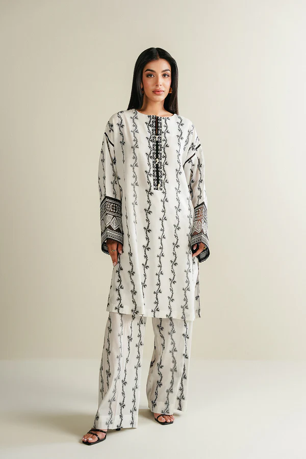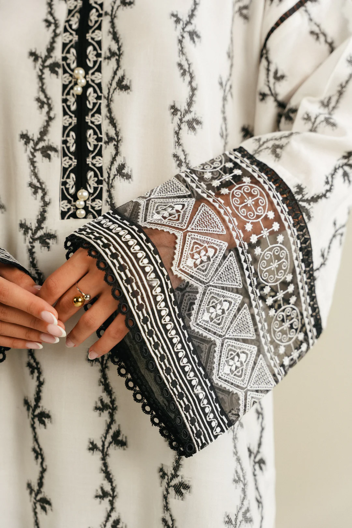 - This top made in black and white soft viscose-jacquard fabric features crew neck with hook and eye closure on front, embroidered placket with pearl bunches, flared sleeves with embroidered cuffs and side slits. It has lace insertion in armhole and sleeves.