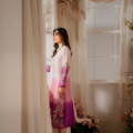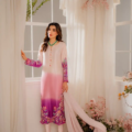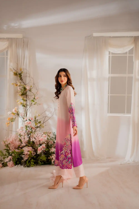 Elevate your festive look with the Dua dress, featuring floral motifs on a blush pink base with purple and mint green accents. The buttoned neckline and modern cut with color-blocking enhances its charm. Paired with a straight pants, this ensemble epitomizes festive elegance.