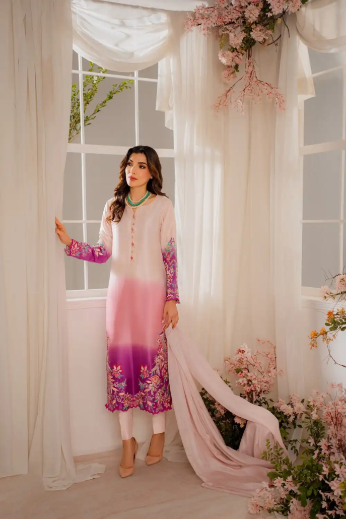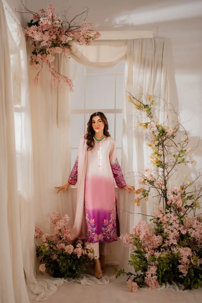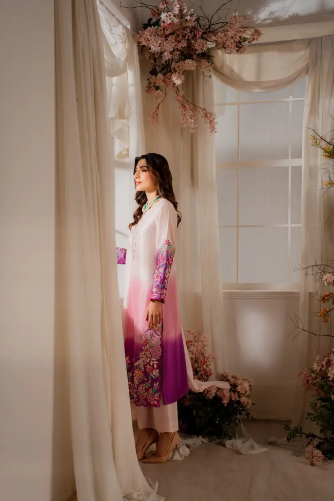 Elevate your festive look with the Dua dress, featuring floral motifs on a blush pink base with purple and mint green accents. The buttoned neckline and modern cut with color-blocking enhances its charm. Paired with a straight pants, this ensemble epitomizes festive elegance.