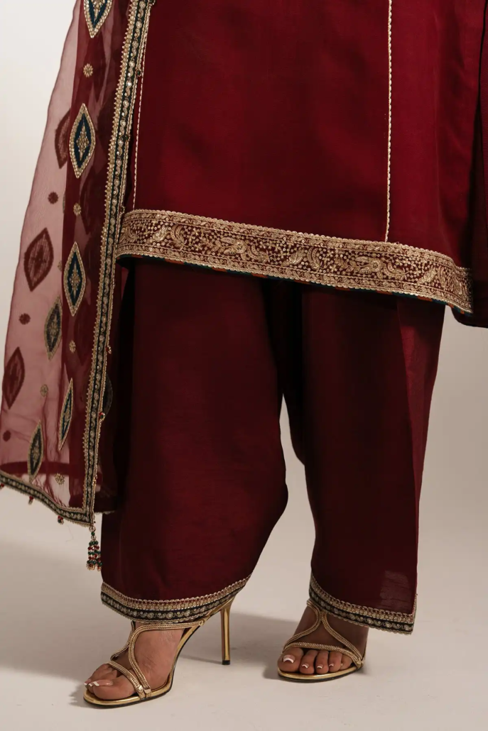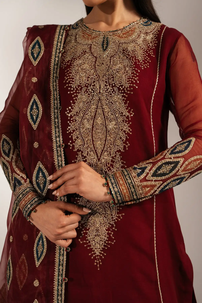 Expertly crafted with embroidered chiffon details on the front, sleeves, front and back border, and bottom border, this elegant UC-3072 adds a touch of sophistication to any occasion. The dupatta is made of embroidered organza, while the back is dyed chiffon and the bottom is dyed rawsilk.