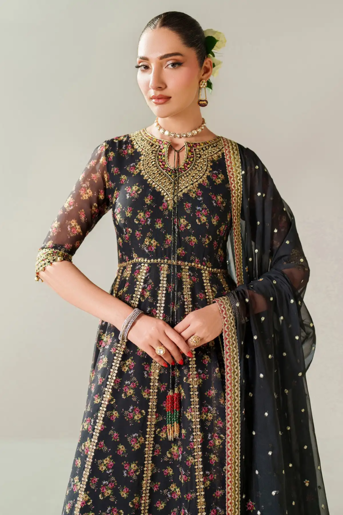 This embroidered chiffon ensemble features digitally printed and intricately embroidered chiffon panels on the front yoke, back, and sleeves, complemented by detailed embroidered borders. The dupatta showcases matching digital prints with an embroidered border, enhancing its elegance. The dyed raw silk bottom and bottom crush add a refined texture, creating a sophisticated and cohesive look ideal for formal occasions.