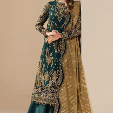 Experience elegance with the EMBROIDERED CHIFFON UC-3094, featuring digitally printed and embroidered chiffon on the front yoke, panels, and sleeves for a refined look. The design is enhanced by embroidered borders on the front, back, and sleeves, complemented by a digitally printed laser-embroidered chiffon dupatta. The dyed rawsilk bottom adds a luxurious finish, making this ensemble perfect for sophisticated occasions.
