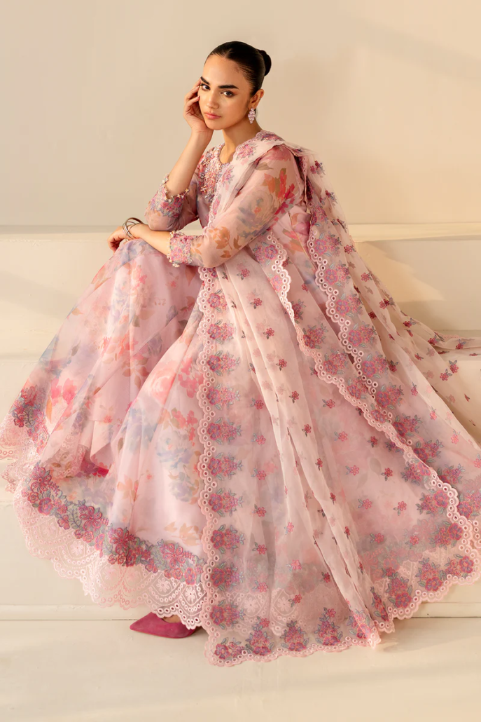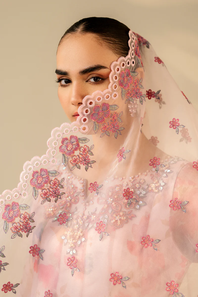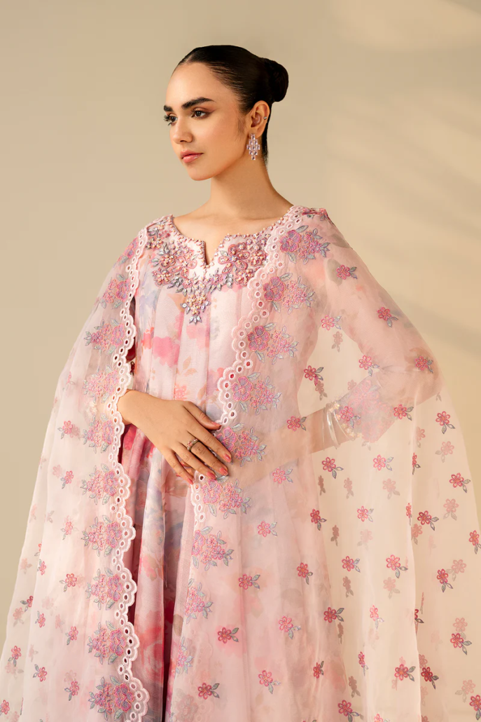 This elegant ensemble features an embroidered cotton frock with a delicately hand-embellished neckline, paired with an embroidered organza dupatta that adds a graceful touch. The comfortable grip trousers complete the set, which also includes matching accessories for a polished look. Perfect for special occasions, this outfit blends traditional craftsmanship with effortless style.