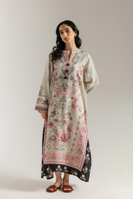 Step into a world of blooming elegance with this beautiful floral dress. The long, flowing silhouette in a soft, muted green fabric is adorned with a stunning, large-scale floral print in shades of pink and red. The look is completed with a contrasting black bottom featuring a matching floral print at the hem. This ensemble is a celebration of graceful color and timeless design, perfect for a sophisticated yet relaxed style.