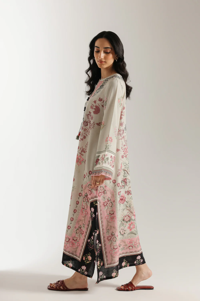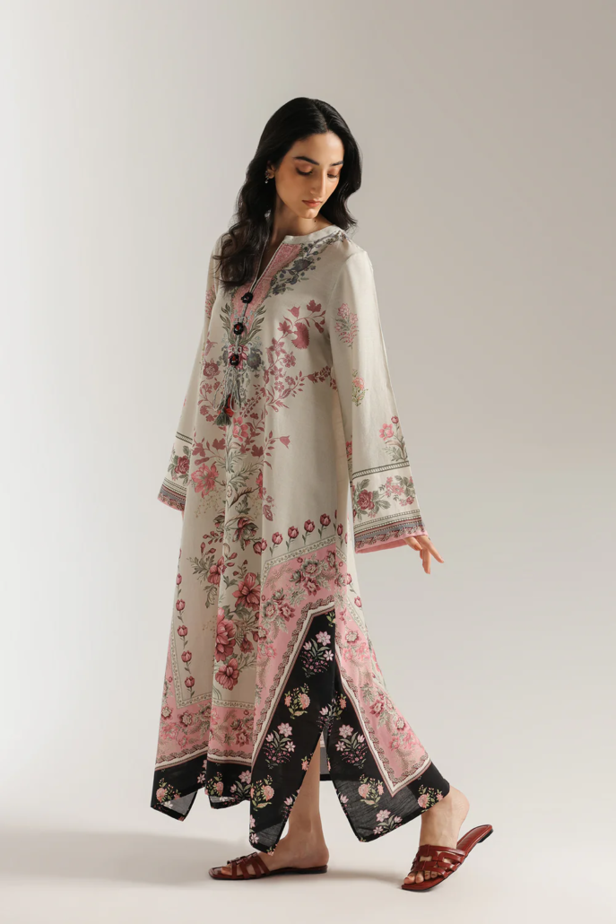 Step into a world of blooming elegance with this beautiful floral dress. The long, flowing silhouette in a soft, muted green fabric is adorned with a stunning, large-scale floral print in shades of pink and red. The look is completed with a contrasting black bottom featuring a matching floral print at the hem. This ensemble is a celebration of graceful color and timeless design, perfect for a sophisticated yet relaxed style.