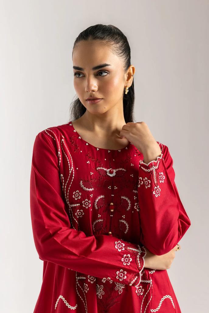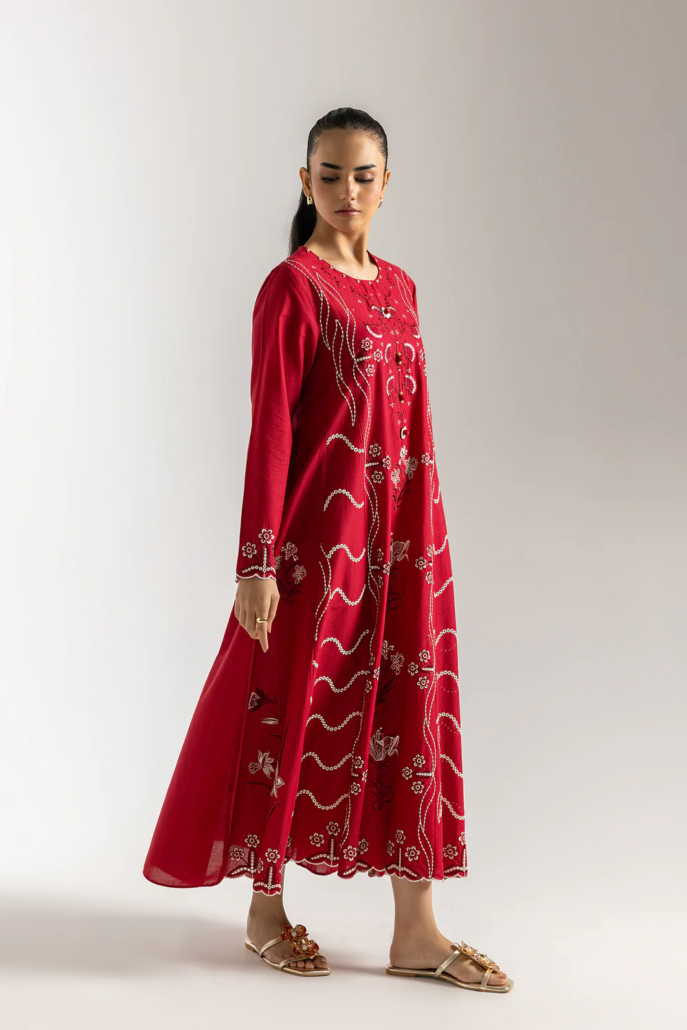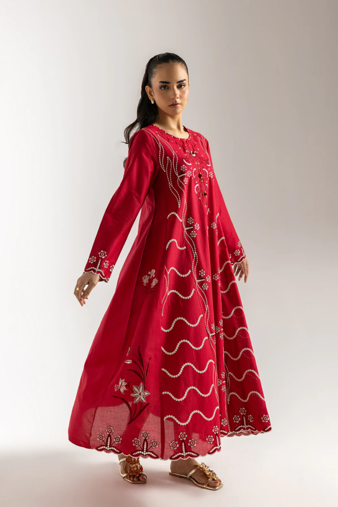 DRESS – FLARED FIT – ROUND NECK – FULL SLEEVES – SCALLOPED HEM – LONG LENGTH