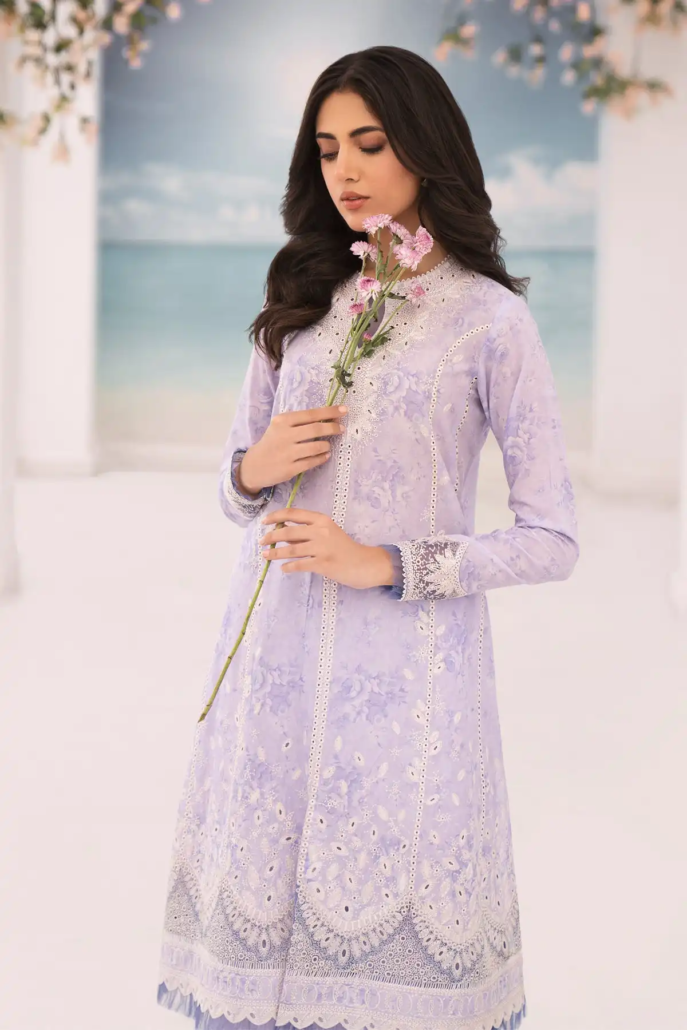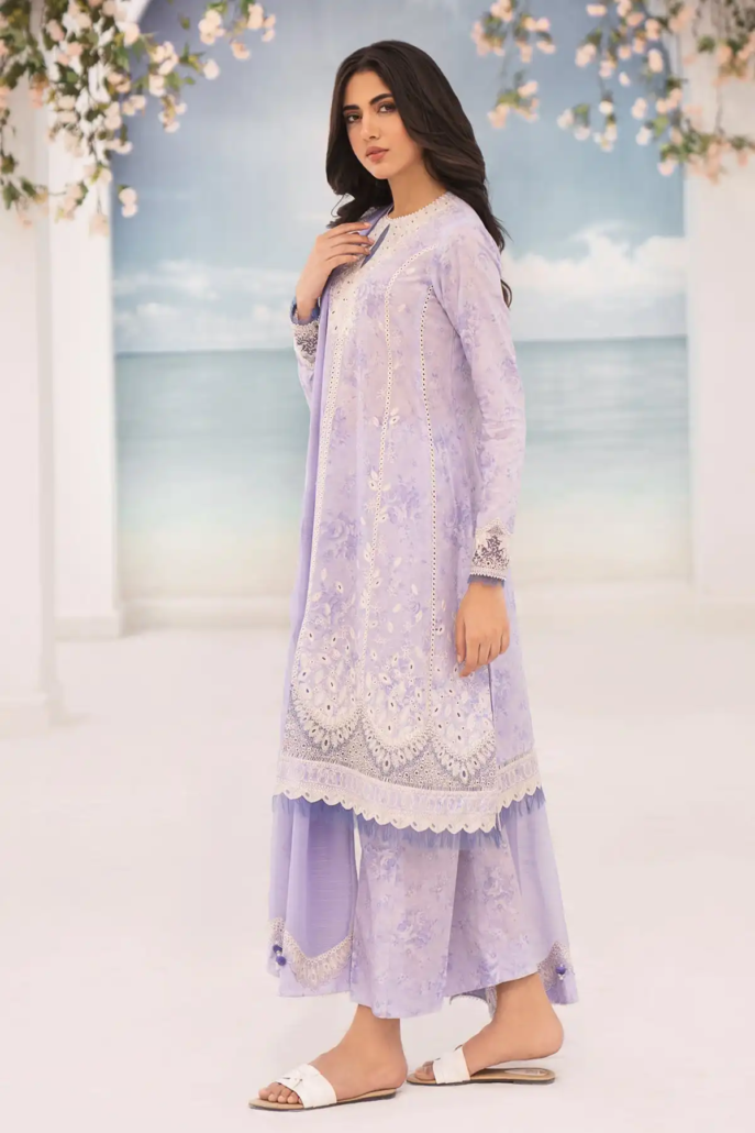 Upgrade your summer wardrobe with our Embroidered Lawn RTW-1084. This 3-piece set in beautiful lilac is made from high-quality lawn fabric, perfect for staying cool and comfortable in the heat. Elevate your style with the intricate embroidery detail.