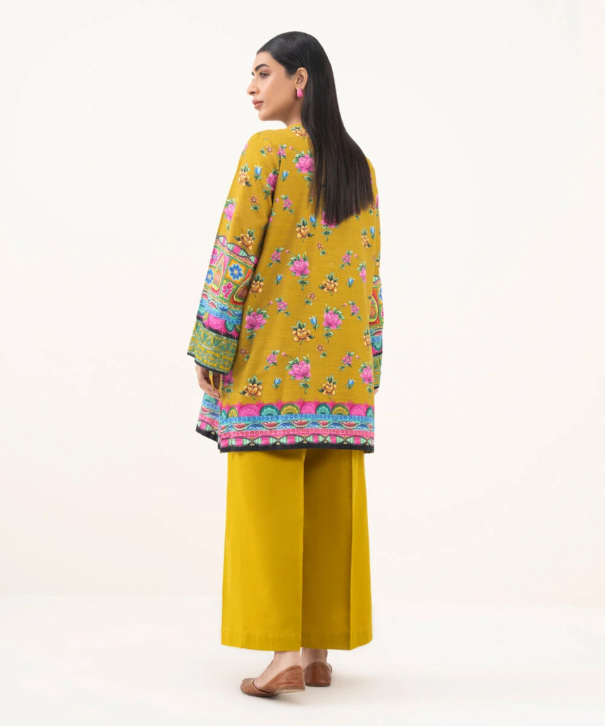 Revamp your wardrobe with our embroidered mustard light khaddar straight shirt featuring a v-neckline.