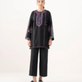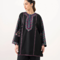 Revamp your wardrobe with our embroidered black light khaddar drop shoulder shirt featuring a round neckline with slit.