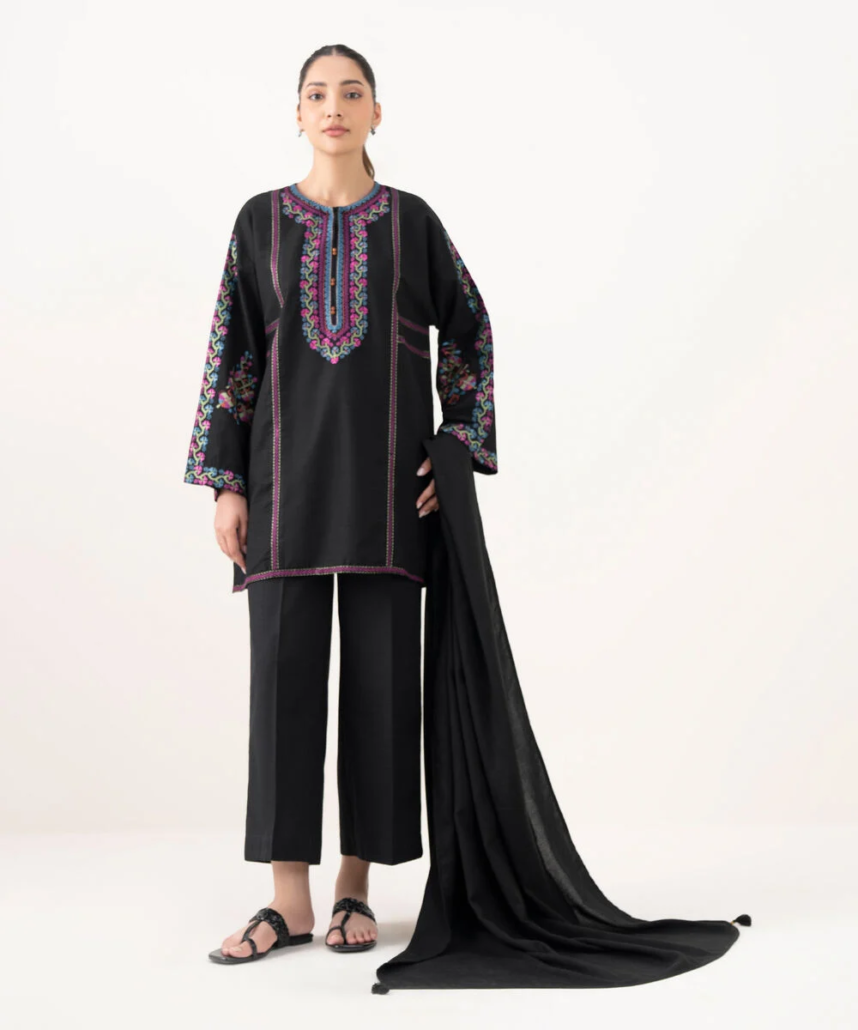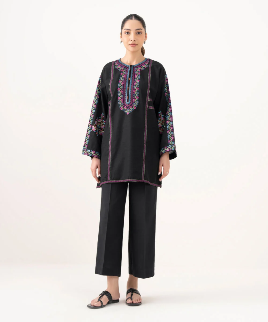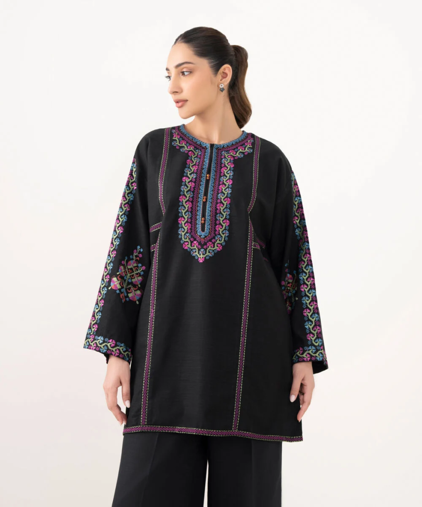 Revamp your wardrobe with our embroidered black light khaddar drop shoulder shirt featuring a round neckline with slit.