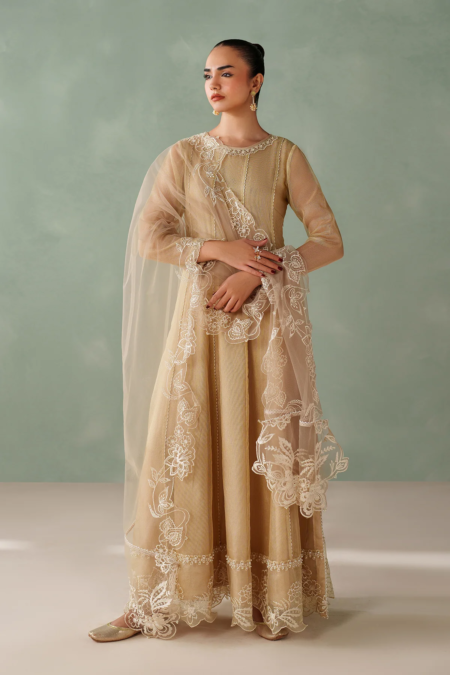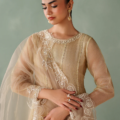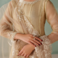 This elegant set features an embroidered Masoori fabric shirt, paired with comfortable grip fabric trousers. The embroidered net dupatta adds a delicate touch, completing the ensemble. Included are the shirt, trousers, dupatta, and matching accessories, offering a coordinated look perfect for special occasions.