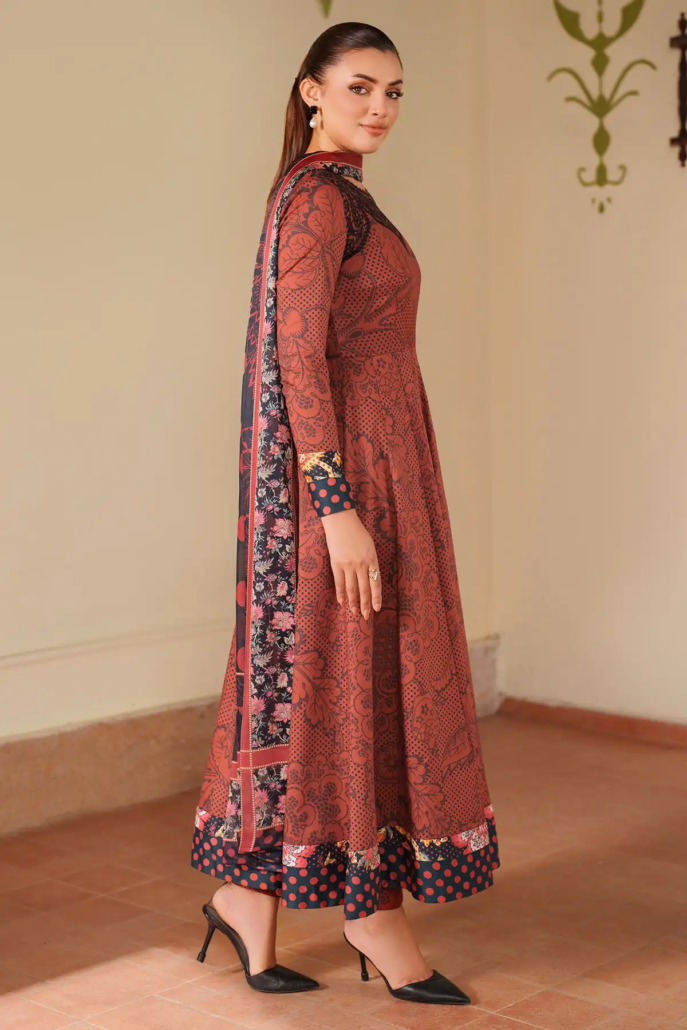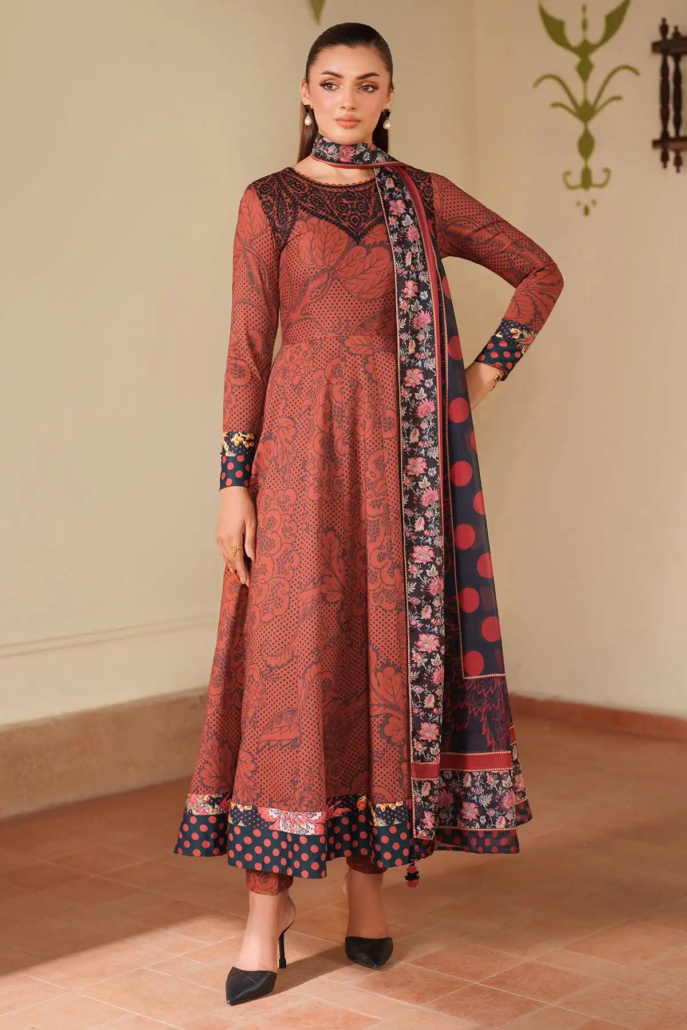 This ensemble features an embroidered premium viscose shirt paired with a digital printed premium viscose bottom, delivering both comfort and elegance. Completed with a digitally printed tissue silk dupatta, the outfit offers a refined texture and vibrant patterns, making it suitable for sophisticated occasions while ensuring a luxurious feel throughout the day.
