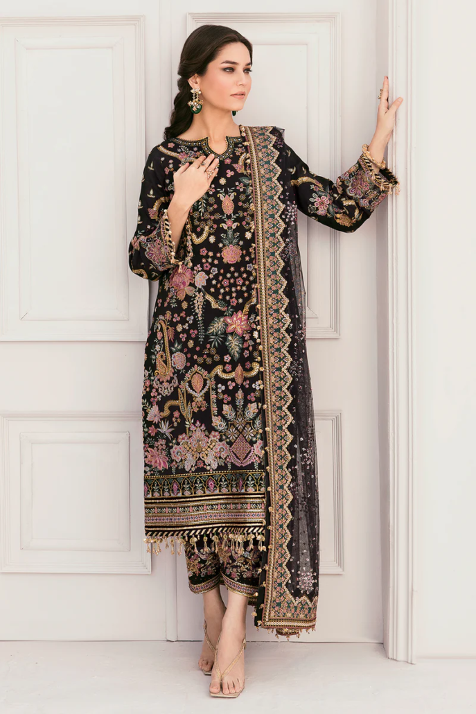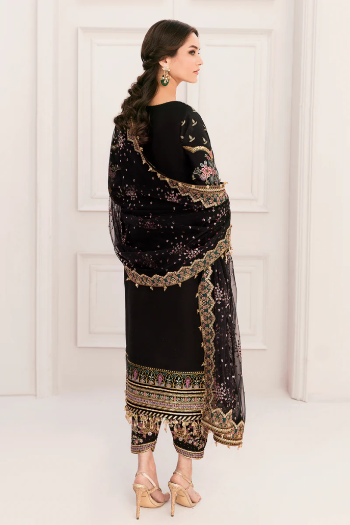 Presenting our 3-piece black-coloured silk ensemble. The shimmering embroidery all over the shirt bestows an ornamental look. The accents of floral patterns create an ethereal vista, while the embellishments of silk, organza and velvet patches elevate the overall outlook. The shirt is paired with embroidered raw silk trousers. The dupatta, adorned with proficiently crafted embroidery, adds a finesse touch.