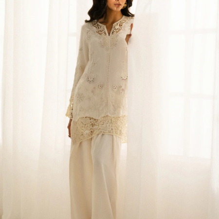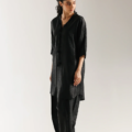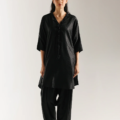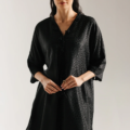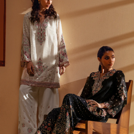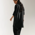 Embrace sophisticated simplicity with this classic black suit. This all-black two-piece ensemble features a subtly textured fabric with a delicate, all-over embossed pattern that adds depth and allure. The classic kurta silhouette offers a comfortable yet refined fit, perfectly complemented by the matching black shalwar. This suit is a versatile and timeless choice, ideal for those who appreciate understated luxury and effortless style.