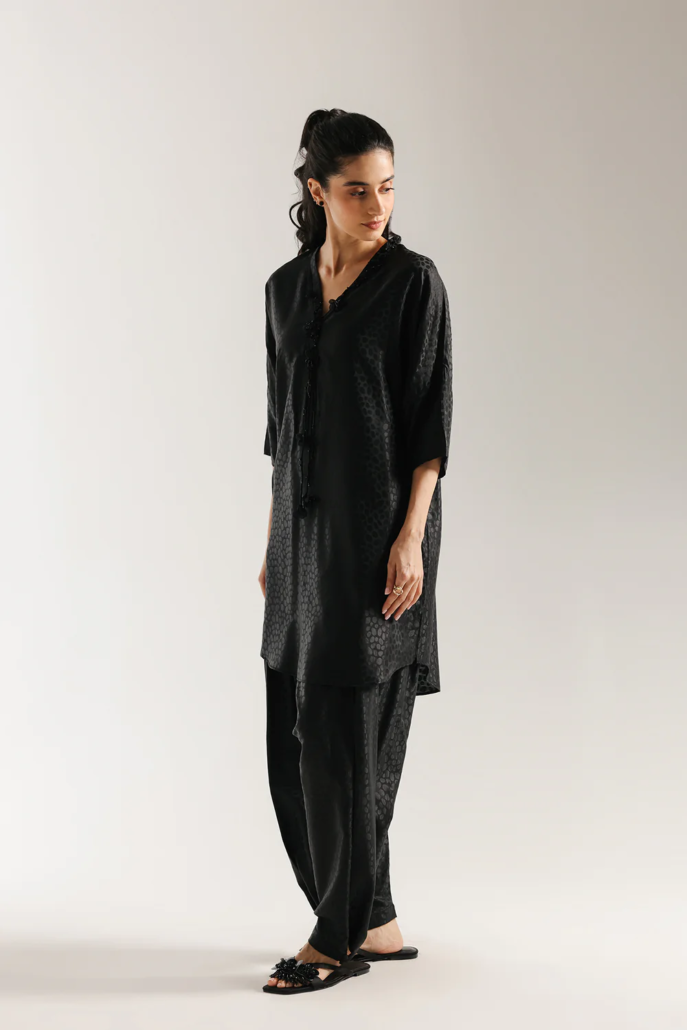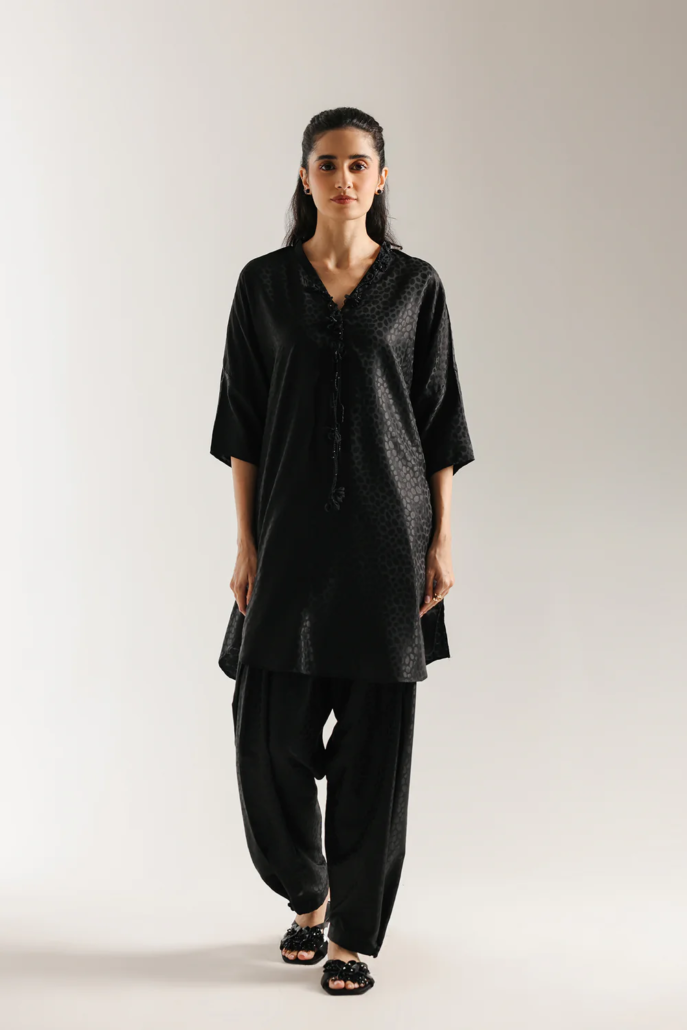 Embrace sophisticated simplicity with this classic black suit. This all-black two-piece ensemble features a subtly textured fabric with a delicate, all-over embossed pattern that adds depth and allure. The classic kurta silhouette offers a comfortable yet refined fit, perfectly complemented by the matching black shalwar. This suit is a versatile and timeless choice, ideal for those who appreciate understated luxury and effortless style.