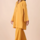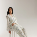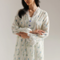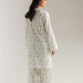 Drift into a dream of delicate beauty with this enchanting suit. The soft, off-white fabric is adorned with a charming scattered print of small blue flowers and subtle green foliage. The straight fit shirt features exquisite white floral lace around the neckline and down the placket, highlighted by delicate lace trim at the sleeve cuffs. The relaxed fit and full sleeves enhance its ethereal appeal, while the matching shalwar complete this vision of understated elegance.
