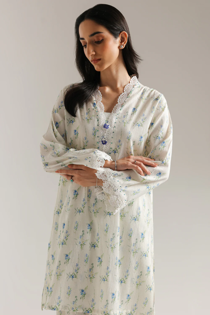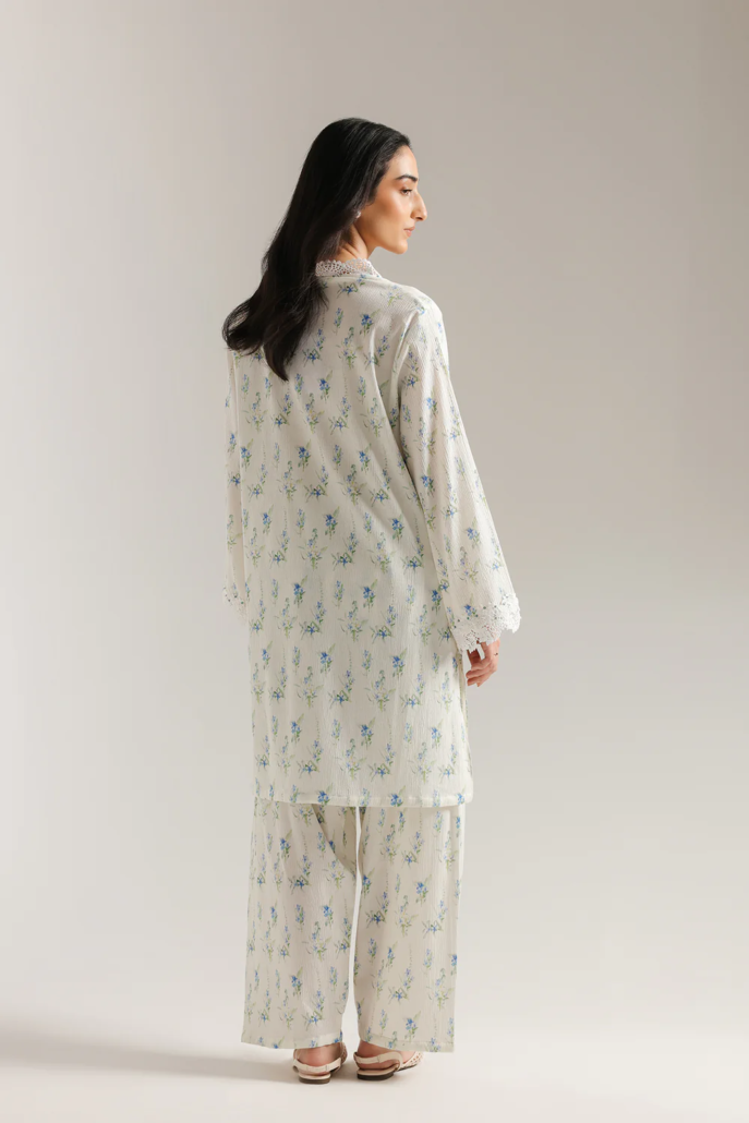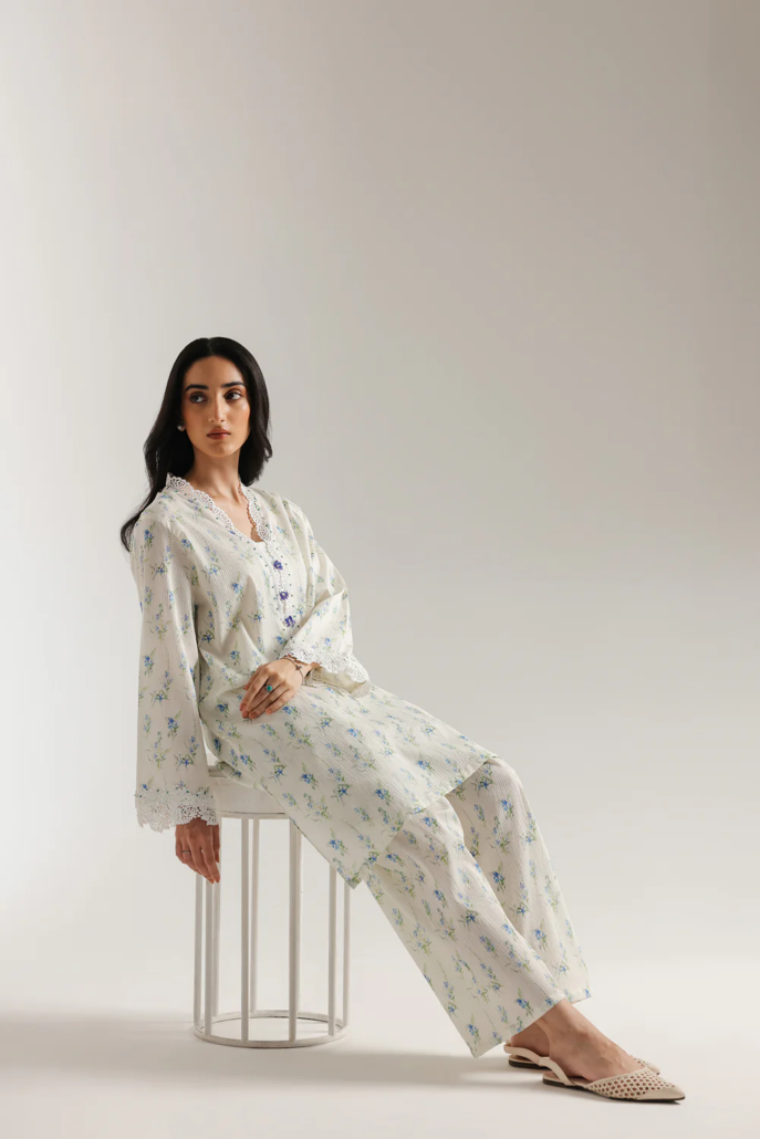Drift into a dream of delicate beauty with this enchanting suit. The soft, off-white fabric is adorned with a charming scattered print of small blue flowers and subtle green foliage. The straight fit shirt features exquisite white floral lace around the neckline and down the placket, highlighted by delicate lace trim at the sleeve cuffs. The relaxed fit and full sleeves enhance its ethereal appeal, while the matching shalwar complete this vision of understated elegance.
