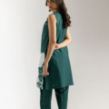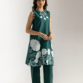 Bask in the refreshing allure of this emerald, green ensemble. The sleeveless tunic showcases a vibrant, contrasting white floral embroidery that blooms across the lower half, complemented by delicate embellishments around the neckline. Paired with flowing, straight cut shalwar in the same rich hue, this outfit is a harmonious blend of contemporary style and timeless elegance. Perfect for embracing the vibrant spirit.