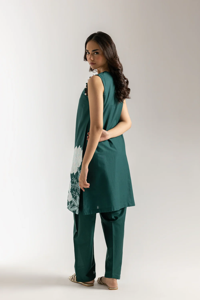 Bask in the refreshing allure of this emerald, green ensemble. The sleeveless tunic showcases a vibrant, contrasting white floral embroidery that blooms across the lower half, complemented by delicate embellishments around the neckline. Paired with flowing, straight cut shalwar in the same rich hue, this outfit is a harmonious blend of contemporary style and timeless elegance. Perfect for embracing the vibrant spirit.