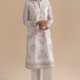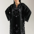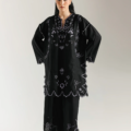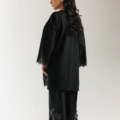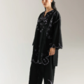 A study in bold contrast and delicate artistry. This exquisite suit features a rich black fabric beautifully adorned with intricate embroidery and delicate cutwork in a light, ethereal hue. The elegant, scalloped hemline of both the shirt and trousers creates a unique silhouette, while the detailed floral patterns on the neckline and sleeves add a layer of sophisticated charm. This is a timeless piece that embodies drama and grace in every stitch.